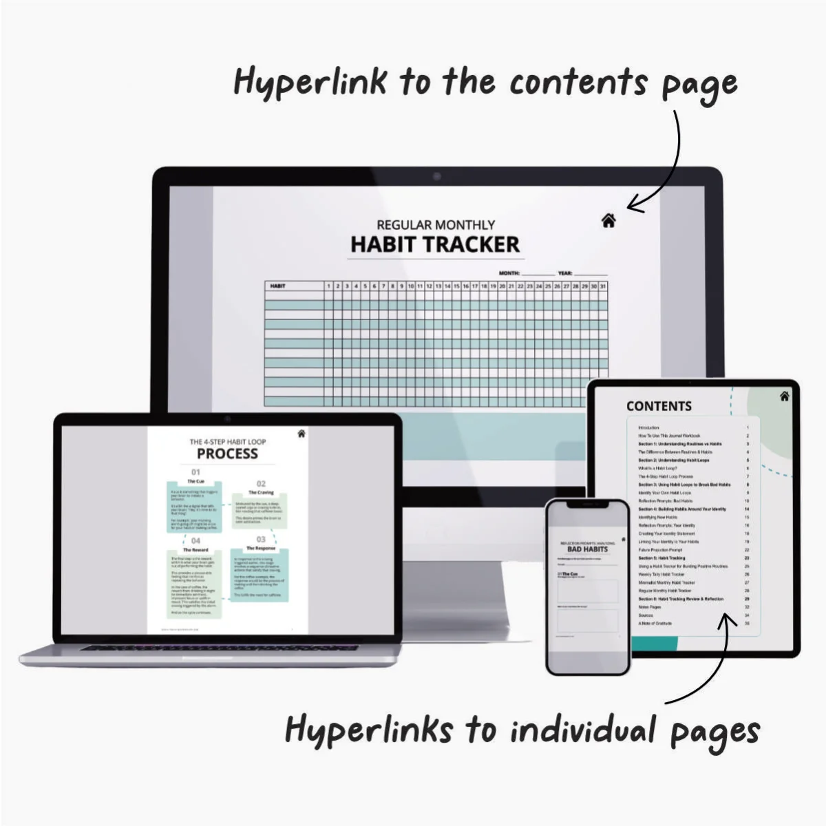 - 3 separate habit tracking pages to track unlimited habits over time.