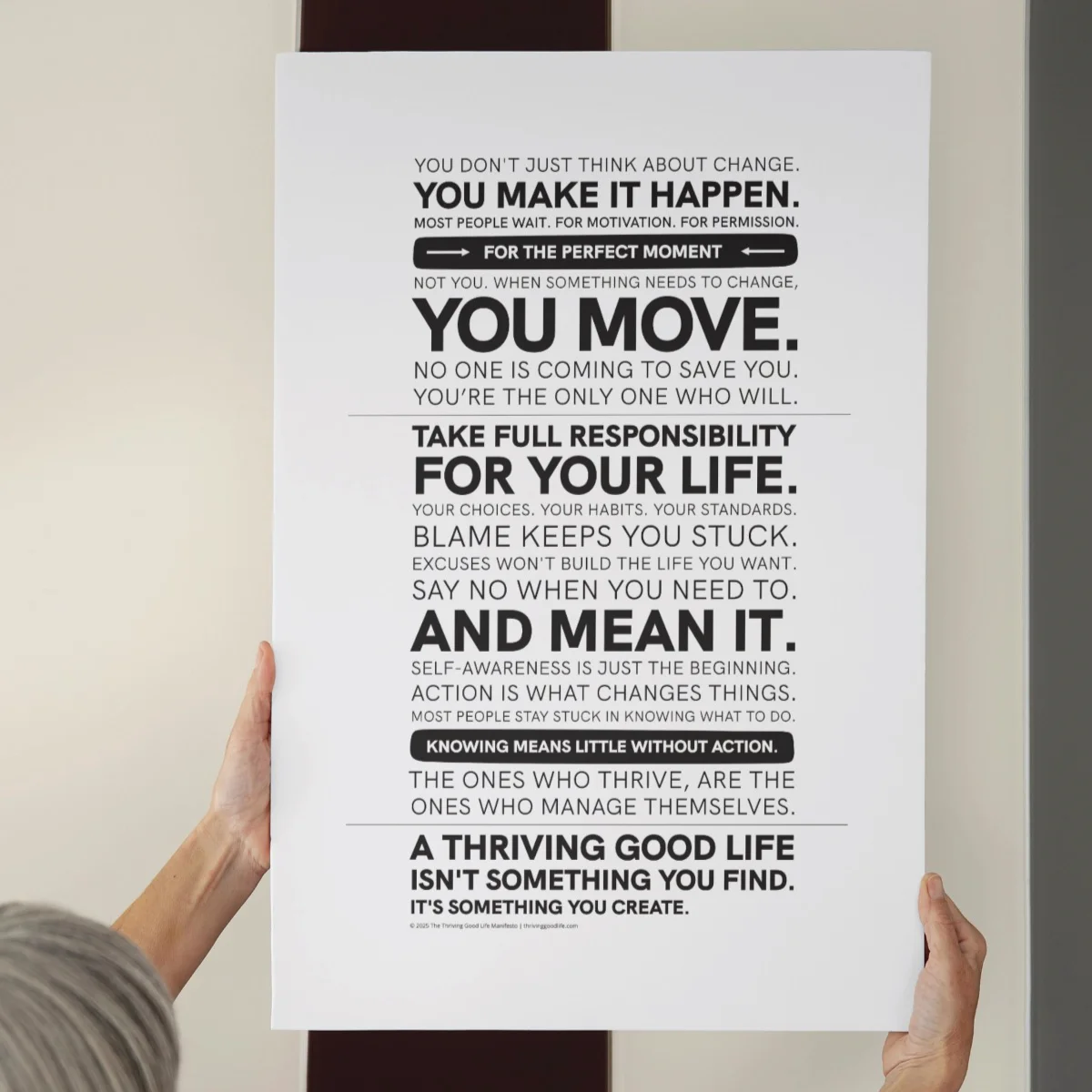 You already know what you need to do. You’ve read the books, done the work, spotted your patterns. But knowing and doing are two different things. This manifesto poster is your daily reminder that self-awareness without action changes nothing.